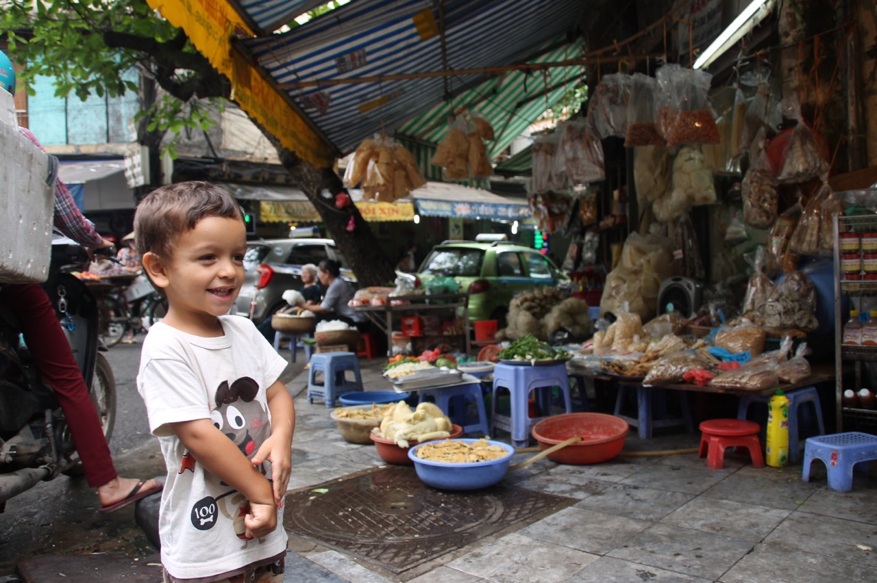 Lucas observando atentamente o mercado nas ruas de Hanói